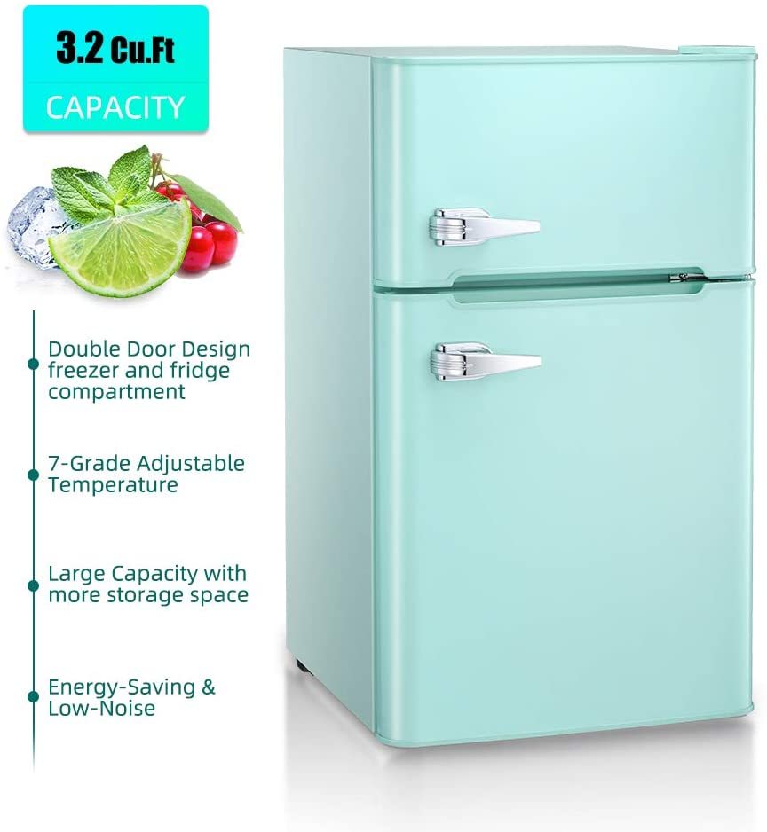 - 【Compact Size & Large Capacity】- The double door electric fridge with 19″(W)x 33.5″ (H)x 20″(D). 0.93 Cu.ft freezer features ample storage space can be used storage your ice cream,meat. And 2.27 Cu.ft fridge area with fruit and vegetable drawer Separately,can keep fruits and vegetables fresh longer. The inside of the door with racks (which prevent from falling)also can store food,you can place bottles and cans.More spacious than usual mini-fridge.