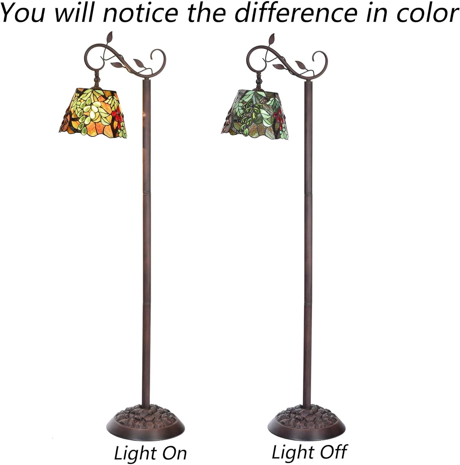 This is a grape floor reading lamp with a stained glass lampshade and tree trunk base, there is a grapevine on the top, the grape lampshade is made of red and green glass jewels, it looks amazing when you light it up, you can use it for your living room, dark corner, dining room, entrance hall, etc, you definitely will receive many compliments.