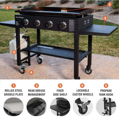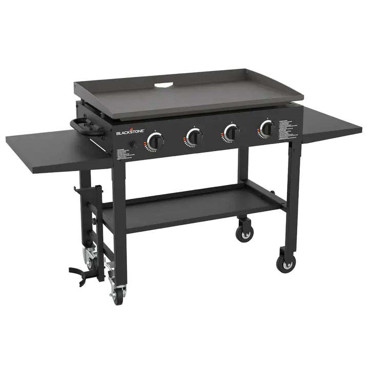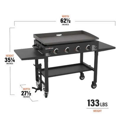 As the cornerstone of Blackstone Products, our 36-Inch Griddle Cooking Station offers an expansive 36" x 21", 756 sq. in. cooking surface; easy assembly with a quick and easy ignition button; two cantilevered work surfaces and a bottom shelf to make food preparation convenient; easy to remove griddle top, held stable by a stout steel frame and four industrial strength caster wheels, 2 of which lock; thick cold rolled steel griddle cooking surface; steel frame powder coated in protective black; and four independently controlled 15,000 BTU stainless-steel burners, for a total of 60,000 BTUs controlled low-to-high for versatile cooking options. We know you will love using our Blackstone 36" Griddle Cooking Station this summer as much as we will!