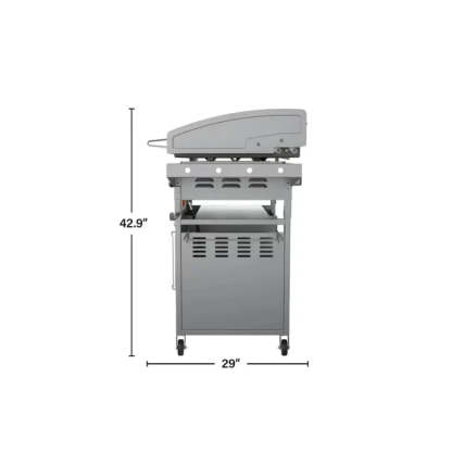 • COMFORT AT YOUR FINGERTIPS – This Griddle comes with a side shelf for placing a cutting board and a garbage bag holder. 1 Lower shelf for easy storage of food and utensils. Easily wheel around your yard or transport from your backyard to the campsite thanks to the removable griddle top, fold up legs and four industrial strength caster wheels. Side handles for easy maneuvering