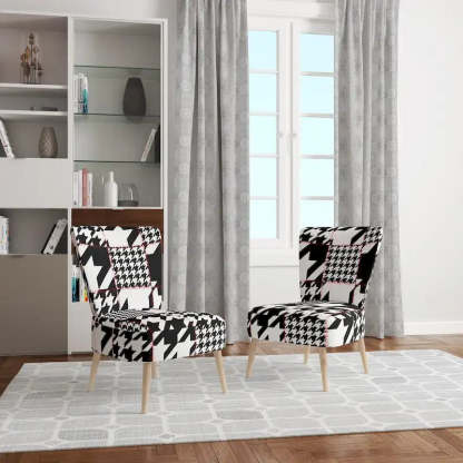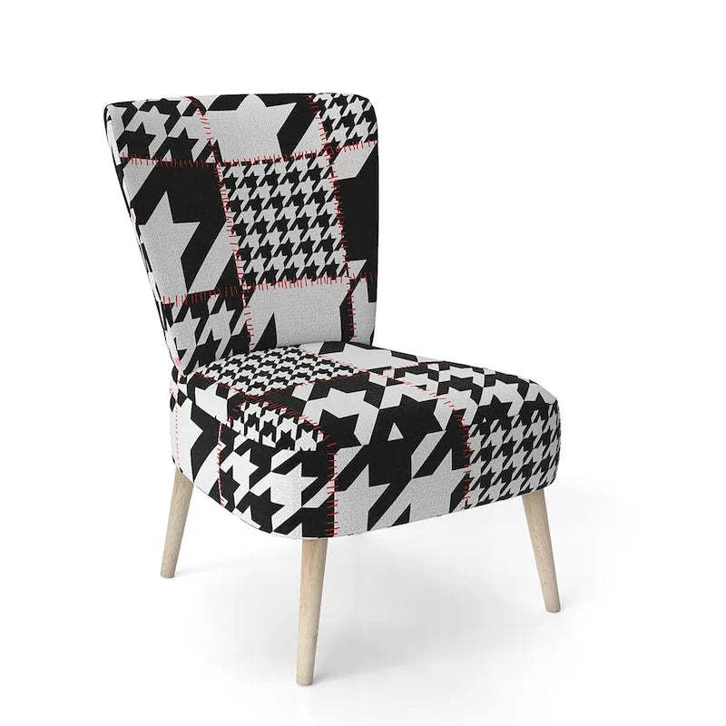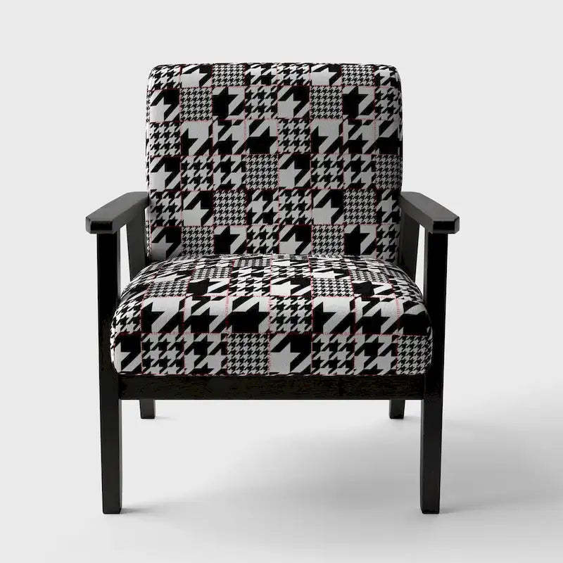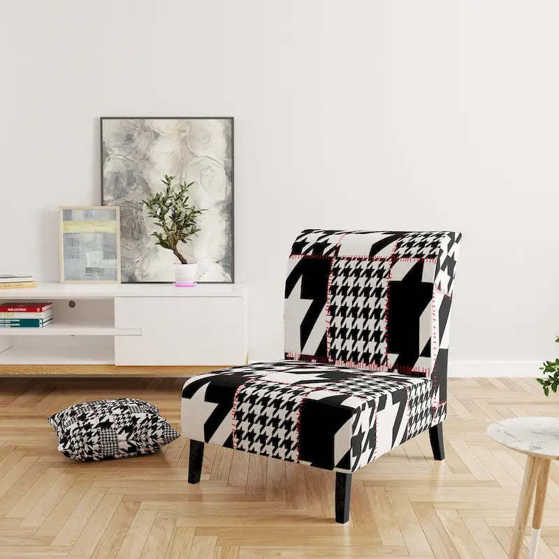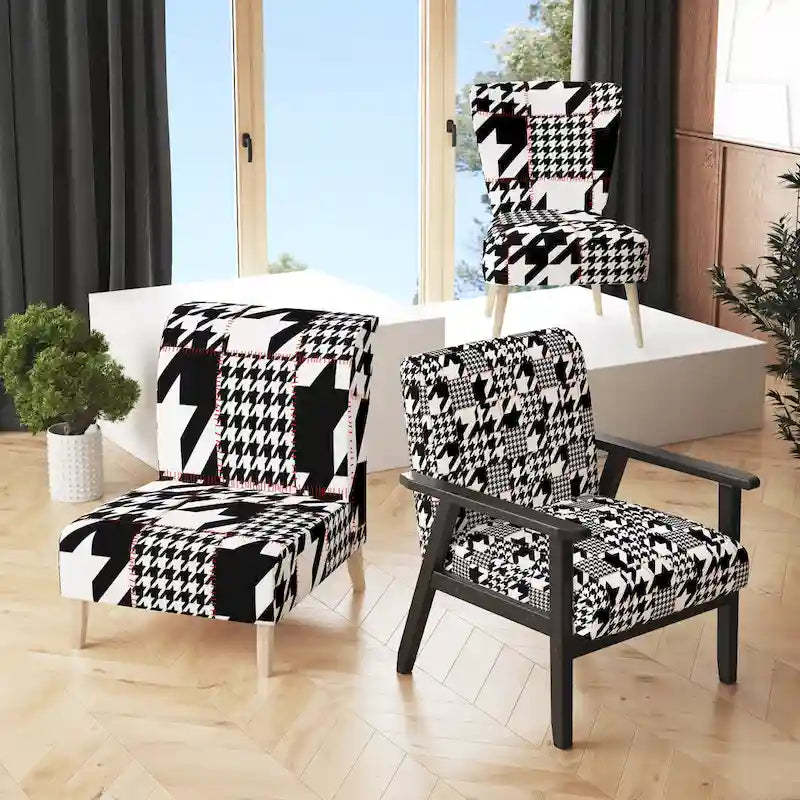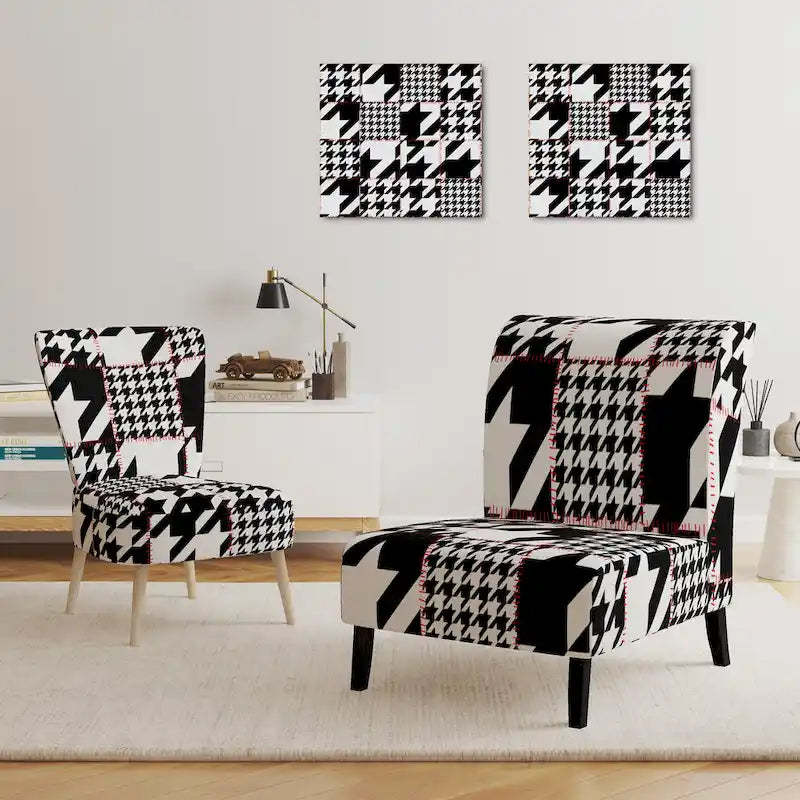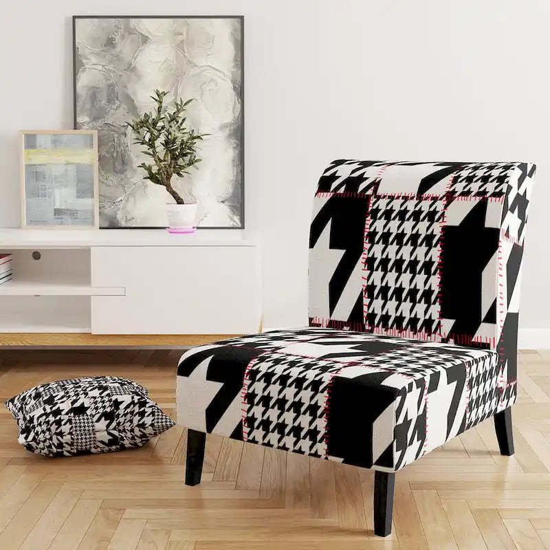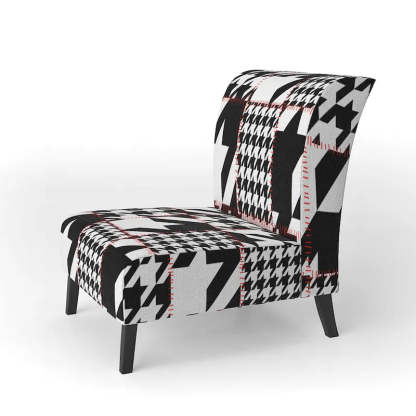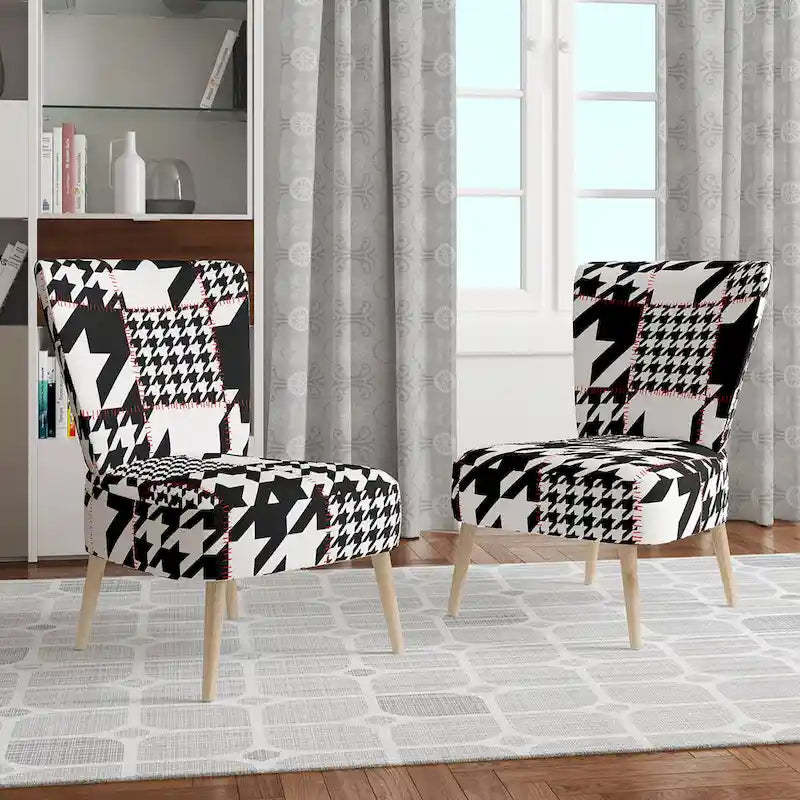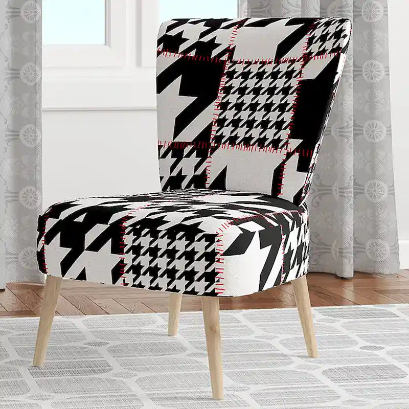 Show off your exceptional tastes with this Designart 'Classic Houndstooth Pattern' accent chair. Boasting houndstooth patterns in black and white for visual interest and mid-century modern appeal, this accent chair is upholstered in fabric, making it soft to sit on. The seat and back have foam filling, making this chair comfortable enough for hours of lounging time. Featuring a rubberwood frame for durable functionality, this slipper chair's patterns are printed using high-density Italian inks for enhanced beauty and lasting vibrancy.