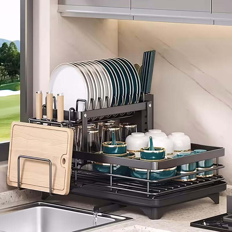 Double-layer Carbon Steel Large Dish Rack with Cutlery, Cup Holder And Drain Board, Space-saving And Durable And Rust-resistant, Suitable for Large Family Gatherings Such As Christmas, Halloween And Black Friday, The First Choice for Gifts