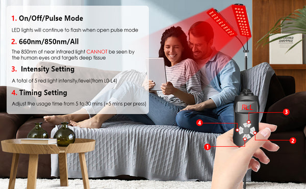 HOME LIGHT THERAPY PANEL LAMP: Say goodbye to expansive & time consuming light therapy in salons, Astarexin red light therapy for body has 660nm red lights and 850nm near-infrared led red lights, features with 4 adjustable brightness levels, each level has steady luminance and pulse modes to meet different red light therapy needs for body pain relief, one-set-of-device solution to various needs according to your practical usages.